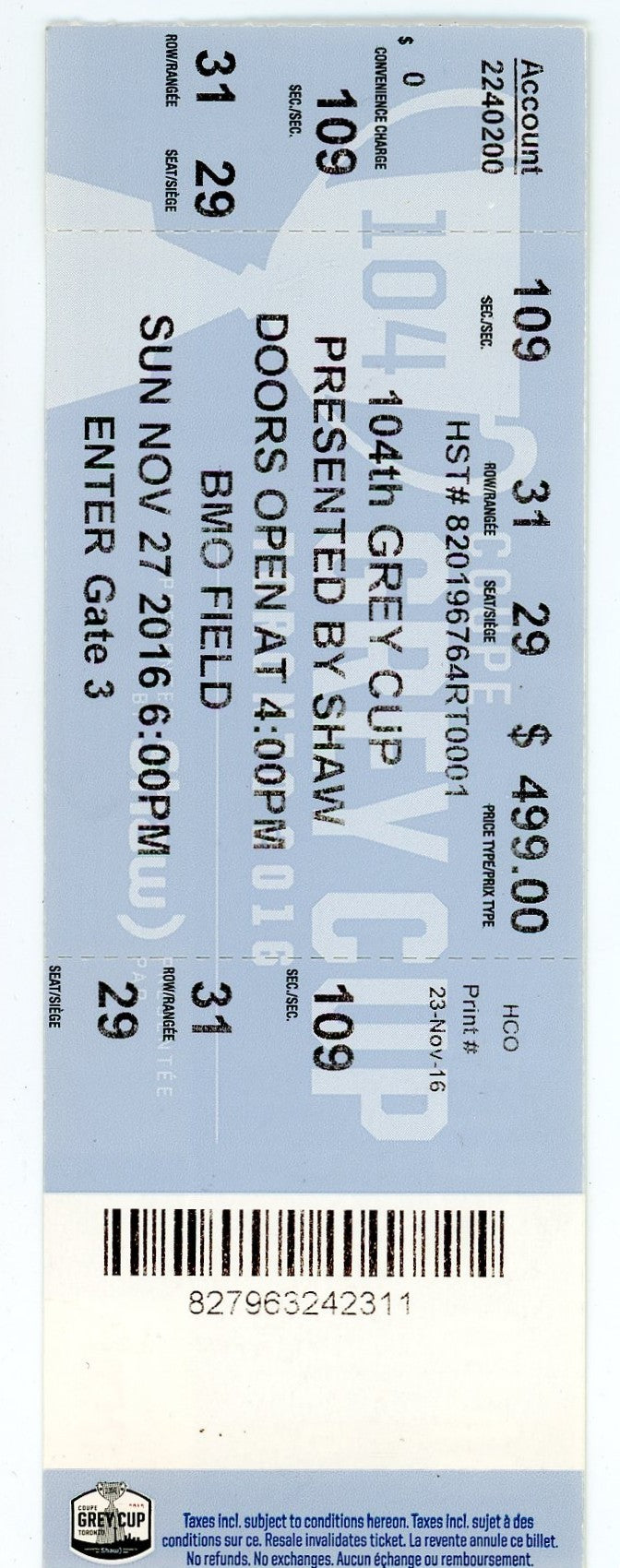 104th Grey Cup CFL Ticket Stub BMO Field (Toronto, 2016)