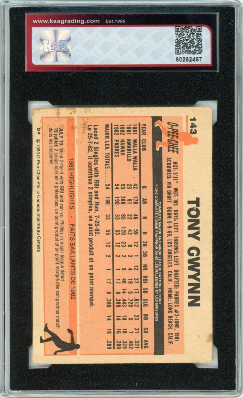 1983 OPC O-Pee-Chee Tony Gwynn Graded Rookie Card #143 KSA 2.5